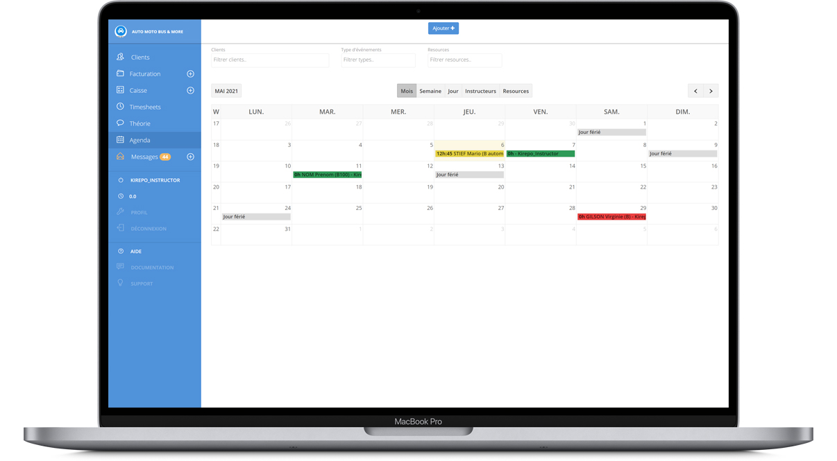 Consultez votre agenda digital pour gérer les time-sheets de vos instructeurs et de vos clients, aussi en application mobile.